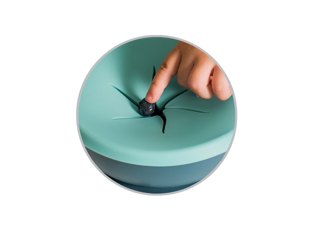 víčko je vyrobeno z poddajného materiálu a povzbuzuje dítě, aby hledalo oblíbené občerstvení, tím rozvijí smysly pro dotek