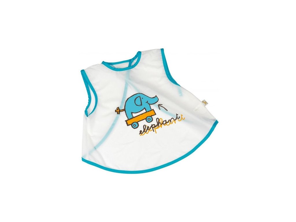 Modře lemovaný omyvatelný bryndák z měkké folie má zapínaní na suchý zip a je zdoben obrázkem slona.
